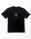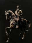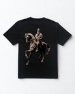 A tribute to Maharaja Ranjit Singh — the fearless, visionary king who changed the game. This deep black tee carries a large back graphic of his equestrian statue, printed in layered textures of puff and velvet for depth and dimension. On the front, a royal crest-inspired floral insignia nods to legacy and leadership.