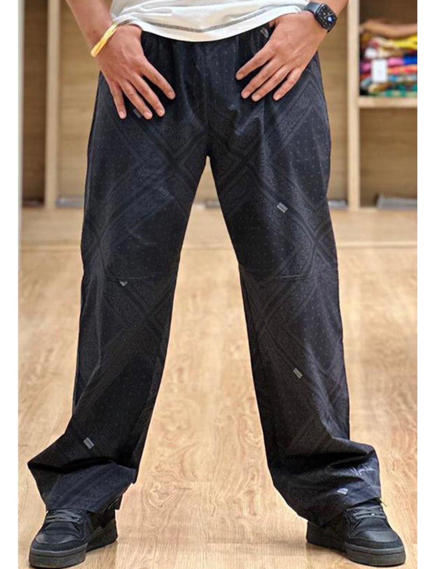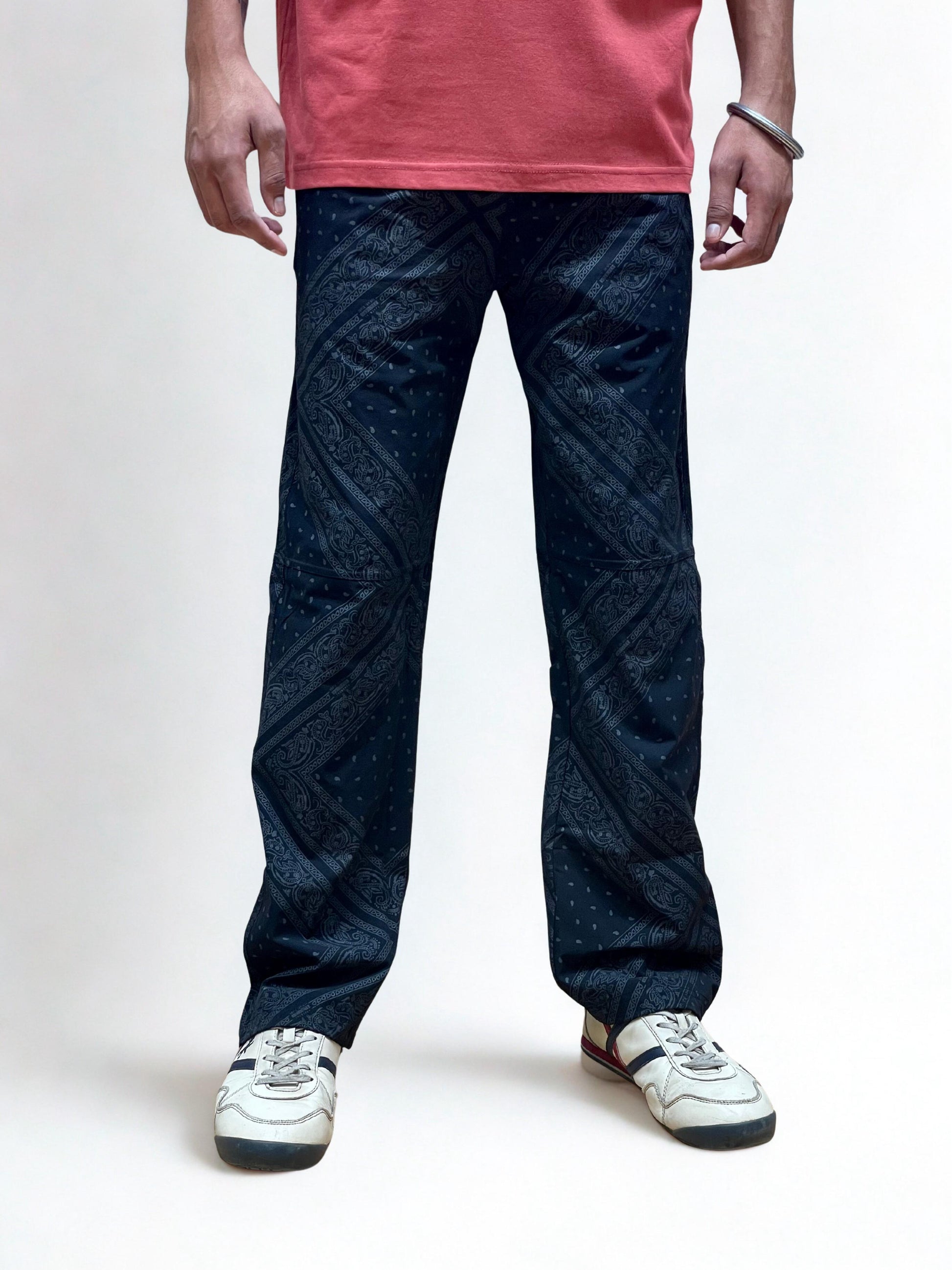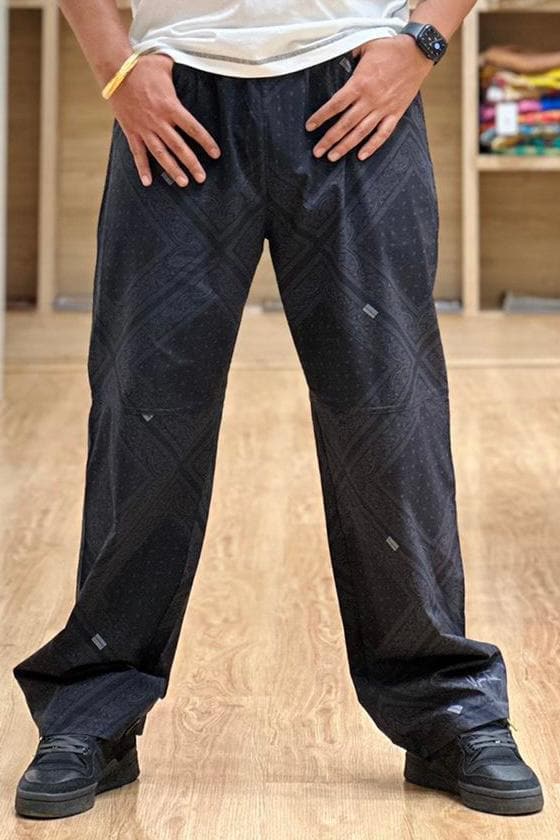 Crafted for everyday rhythm and rugged style, the Nightshade Bandana Lowers are printed in a sleek tonal black-on-black paisley bandana motif that catches light with subtle detail. These straight‑fit pants are cut from a lightweight, flowy stretch fabric that gives way to movement without weighing you down.